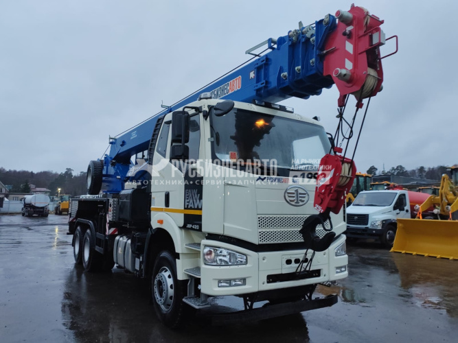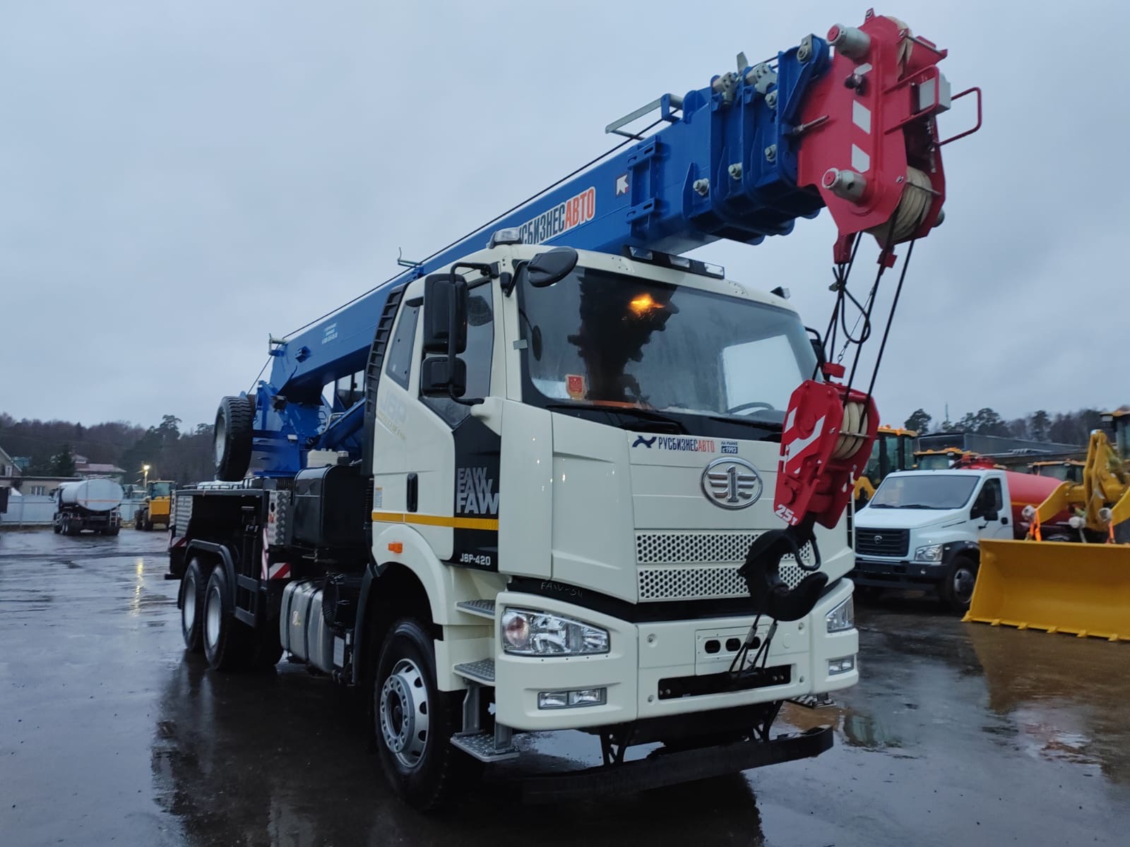 Грузоподъемность 25т, шасси FAW-3250 (6х4), стрела 28 м., опорный контур 5,0 х 6,1, в базовой комплектации противовес 1,5 т., гарантия на кран 18 месяцев или 1000 м/ч. Автокраны на шасси FAW предназначены для выполнения погрузочно-разгрузочных работ. Техника оснащается двигателем, разработкой и производством которого занимается непосредственно завод ФАВ. Мощность ДВС составляет 420 л.с., максимальный крутящий момент – 2100 Нм (1300 об).