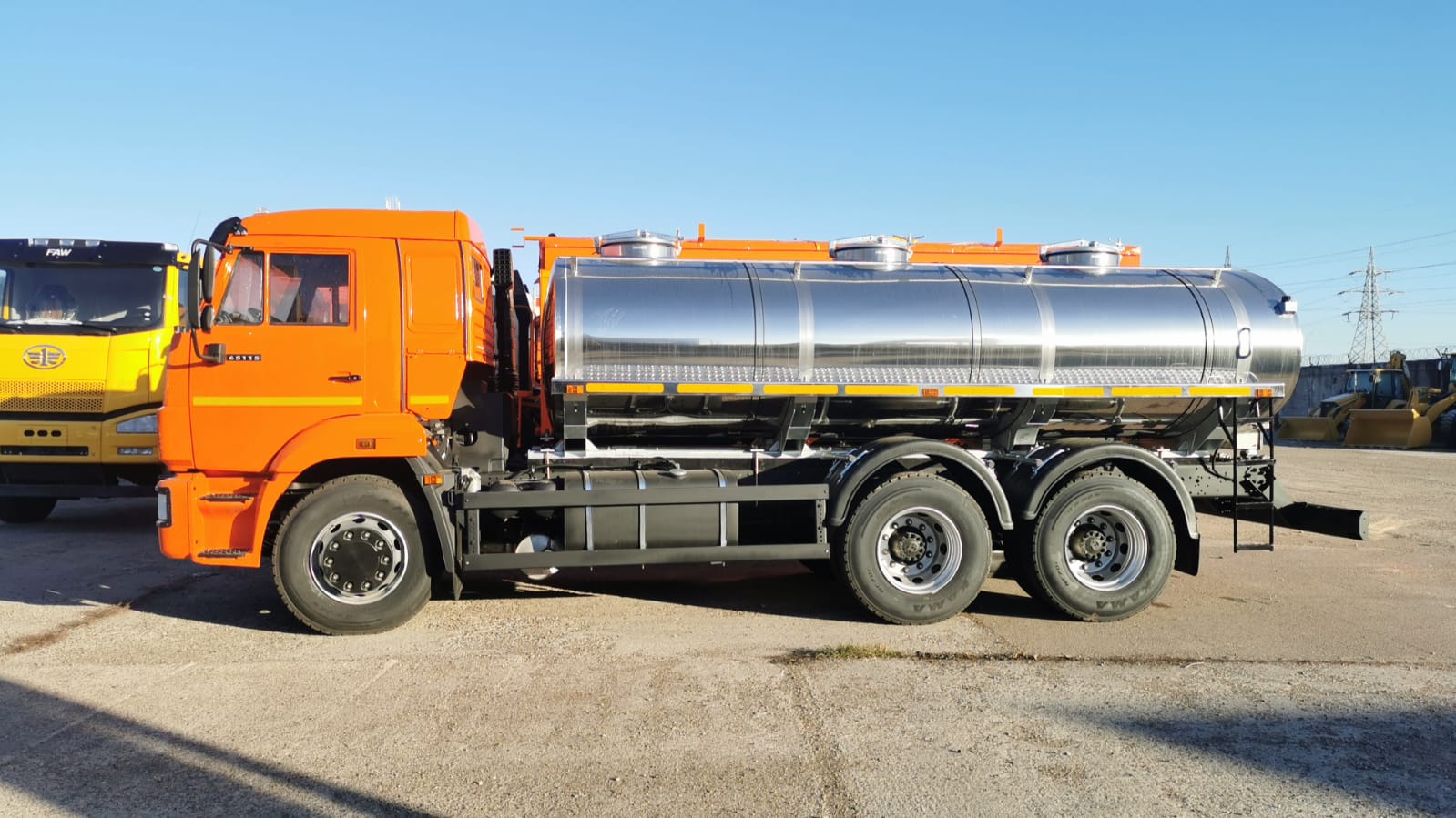 1. Шасси КАМАЗ-65115 2. Колесная формула - 6х4 3. Рабочая вместимость, м3 10 4. Тип цистерны     - эллиптического сечения 5. Технологическая калибровка цистерны - есть, объемным методом 6. Количество отсеков - 3 7. Число горловин - 3, с герметичной крышкой диаметром 500мм. 8. Люки    термоизолированные, с дыхательным клапаном ДУ-50 9. Запорная арматура    донный клапан, один на каждую секцию ДУ-50 10. Управление    ручное механическое, сзади из отсека 11. Материал секций - пищевая нержавеющая сталь AISI-304 12. Материал наружной обшивки цистерны - нержавеющая сталь AISI-304 13. Термоизоляция    ФРП, 50 мм. Не допускает изменение температуры продукта более чем на 2 С0 за 10 часов при разности температур продукта и окружающего воздуха в 30 С0 14. Площадки обслуживания с обеих сторон цистерны, с перфорированной поверхностью против скольжения. 15. Отсек обслуживания - герметичный отсек в задней части  цистерны, закрывается ключом и имеет возможность пломбировки 16. Опора цистерны - Оцинкована (горячее цинкование)