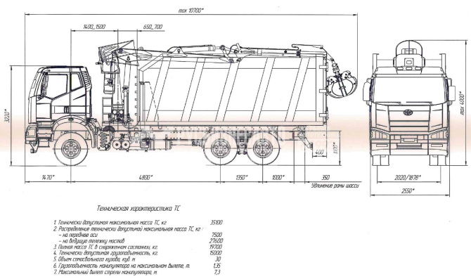 Технические характеристики КМУ Ломовоз FAW 3250 (6*4, 420л.с., Евро-5), кузов 30 куб., Р97М, захват ГЛ-6М