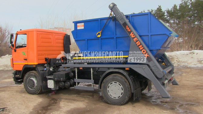 • Производство завода спец.техники WERNOX, РФ, г. Тольятти, Самарская область;     • работа со стандартными сменными бункерами (типа «лодочка») от 8 до 12 куб. м.;     • максимальная грузоподъёмность портала 12000 кг.       • максимальный угол подъёма кузова при самосвальной выгрузке 90 градусов;     • Привод на рабочие органы — гидравлический;     • Время поднятия кузова при самосвальной разгрузке — 42 сек;     • Время опускания кузова с машины на площадку — 45 сек;     • Время подъема кузова с площадки на машину, 35 сек;