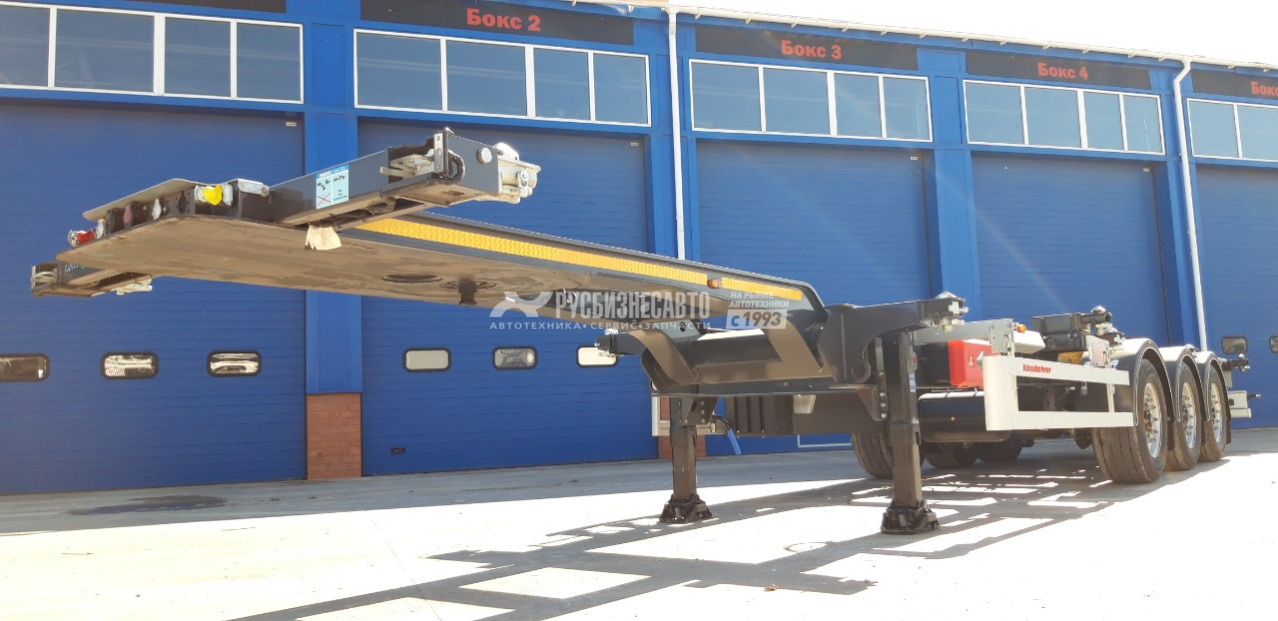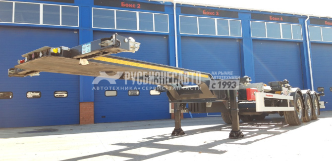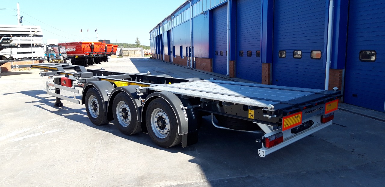 Полуприцеп контейнеровоз для перевозки стандартных контейнеров :1х40 футов, 2х20 футов, 1х30 футов, 1х20 футов посередине, под ссу тягача 1150 мм, оси BPW - 9 тон, дисковые тормоза, без подъемной оси, 6 колес, без запаски, манометр, без задней погрузочной площадки.
