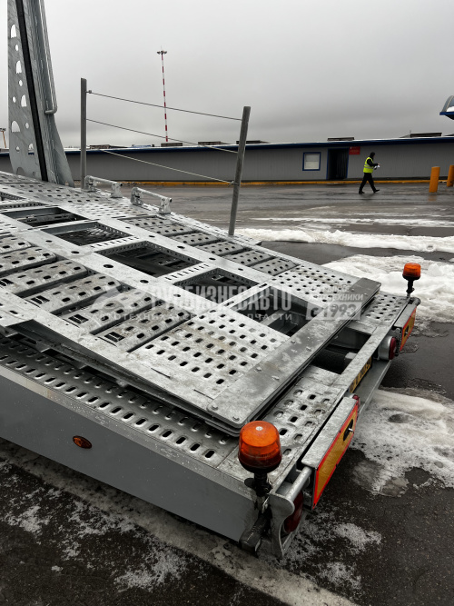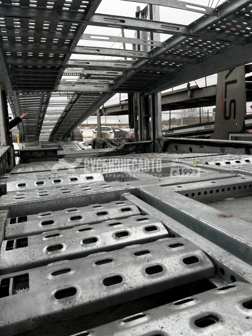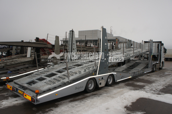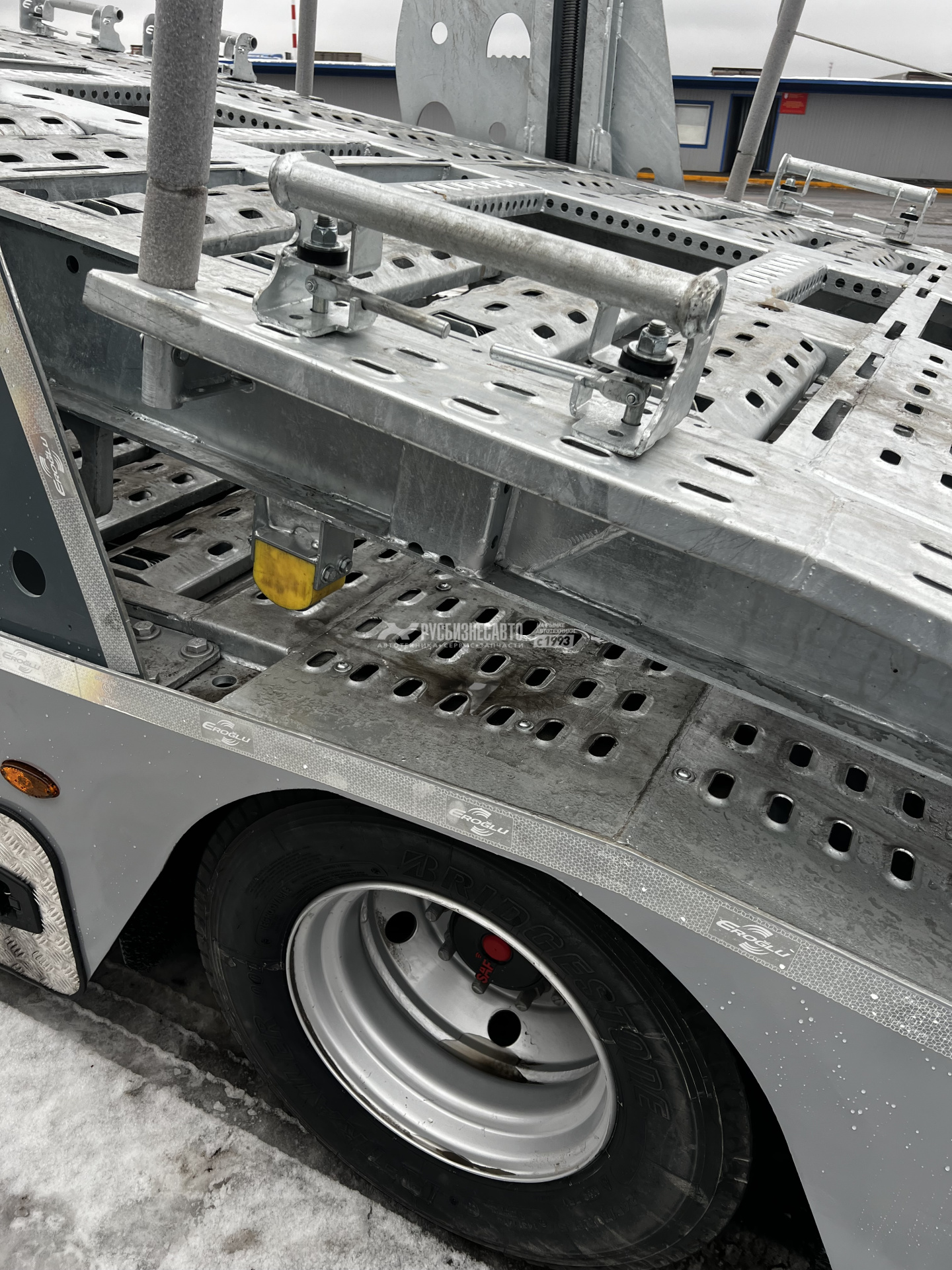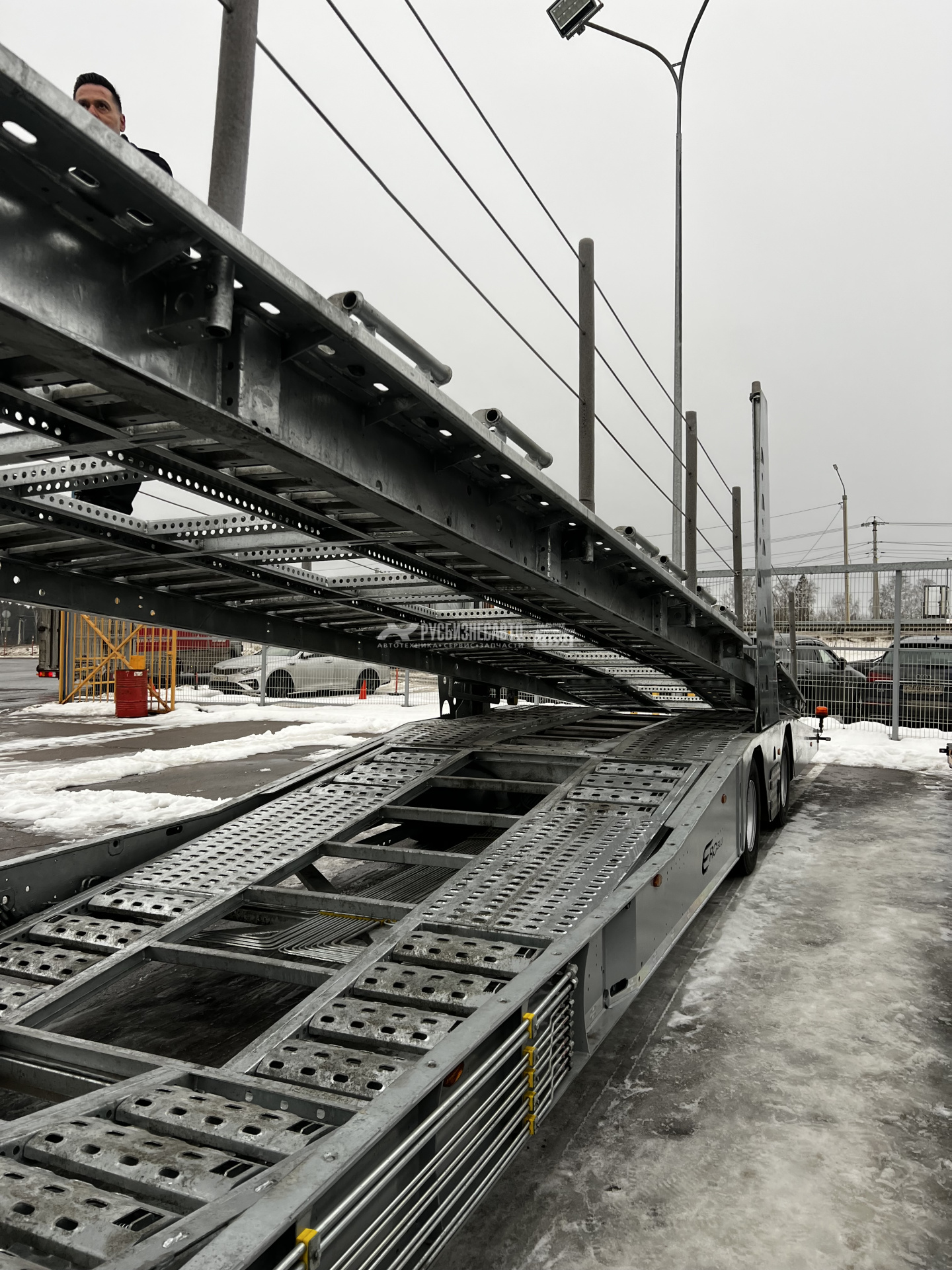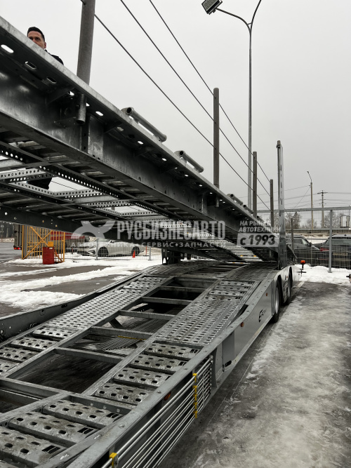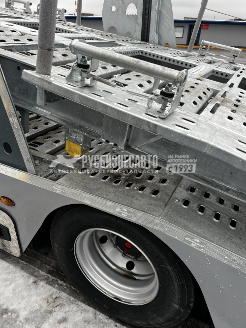Полуприцеп автовоз двухярусный на 8 автомобилей, под ССУ тягача 1050 мм, 2 оси SAF (11 тон каждая), нижний ярус 4 автомобиля, верхний ярус 4 автомобиля, габаритная длина полуприцепа 17 100 мм, ширина внутри 2240 мм, масса собственная - 11 200 кг, г/п 24 800 кг, Гидромоторы шпинделей с приводом от гидрофикации тягача, требования к тягачу : Высота ССУ 1050 мм, нагрузка на ССУ 14000 кг, задний радиус обметания не более 1890 мм.