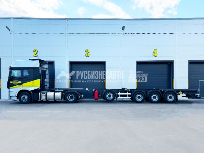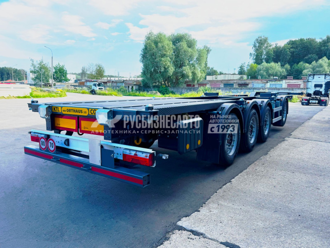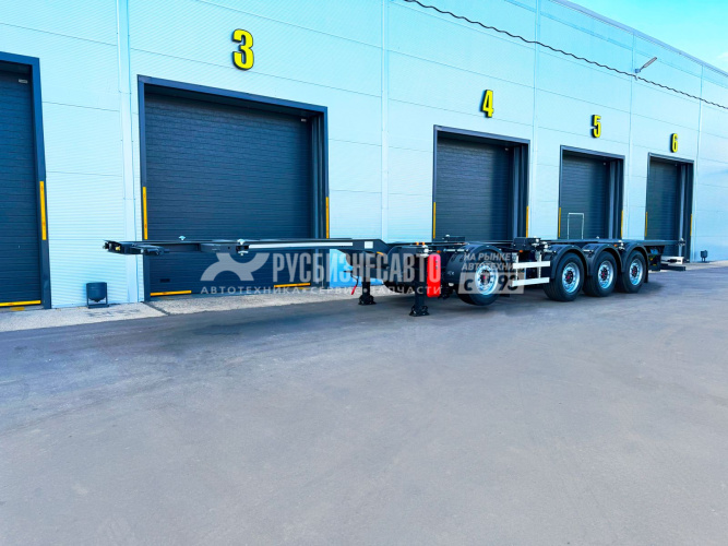 Полуприцеп контейнеровоз 4 оси для перевозки следующих типов контейнеров : 1х20ft , 2x20ft , 1x40ft , 1x40ft HC , 1x45ft , 1x45ft HC, под ССУ тягача 1150 мм, оси SAF Intradisc CD - 4 шт, дисковые тормоза, 1 - ая и 4 - ая ось подъемные, автоматический подъем, 8 колес, 1 запасное, задняя погрузочная площадка, собственная масса 5600 кг, высокопрочная рама из стали ArcelorMittal, сварная конструкция, контейнерные замки JOST, тормозная система Wabco Premium TEBS/Knorr-Bremse с системой ABS 4S/2M и электронной системой устойчивости (Roll Stability)